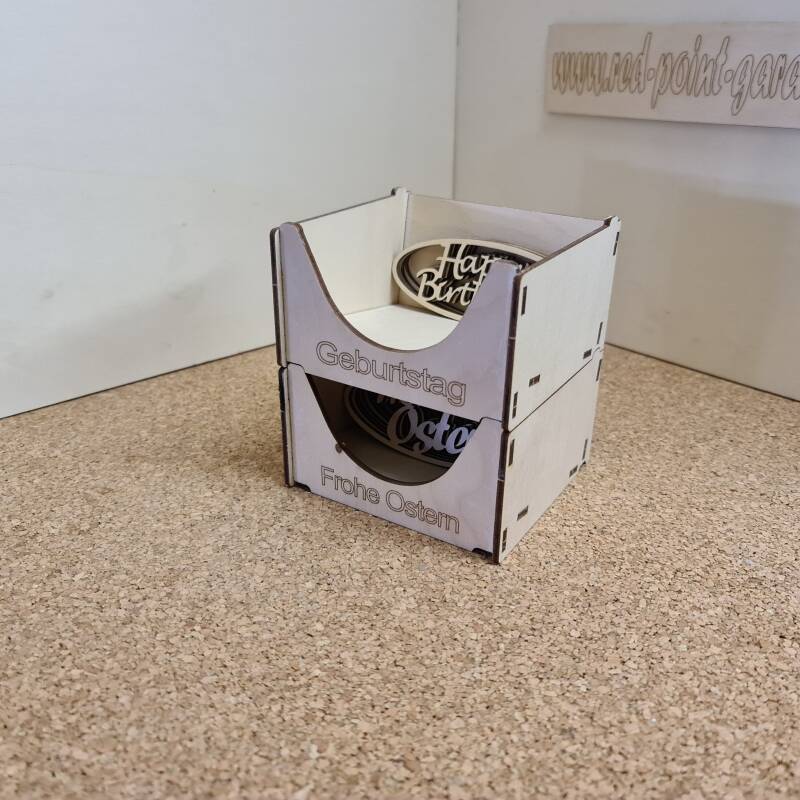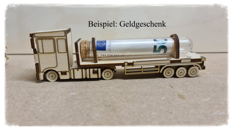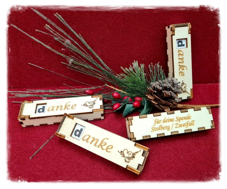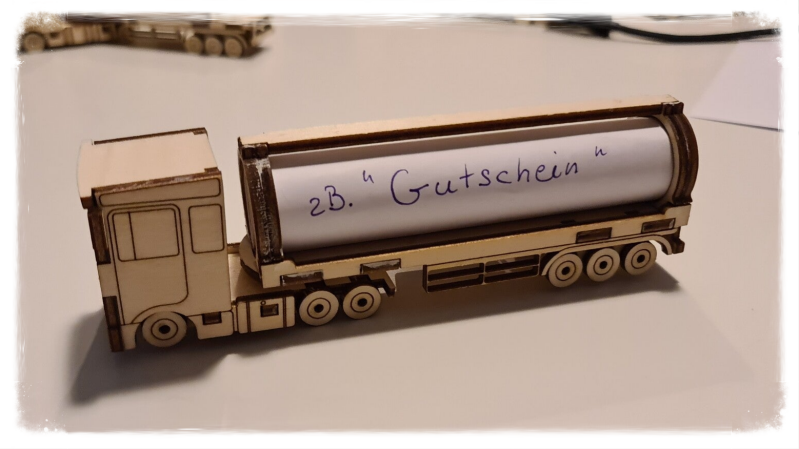 Es gibt jetzt auch einen Auflieger in dem man einen Gutschein einrollen könnte, oder zwei Schokoriegel in Papier mit dementsprechenden DU Text.